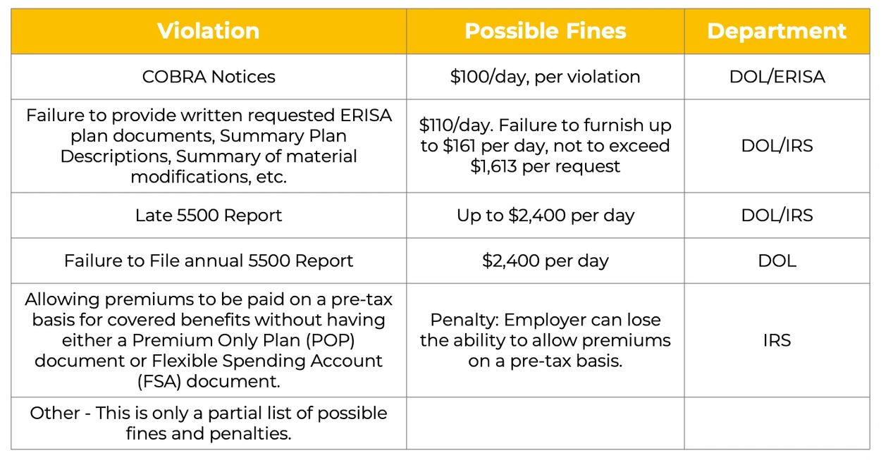 Depending on the compliance violation the Department of Labor (DOL), Internal Revenue Service (IRS) or Department of Health & Human Services (HHS) may impose fines or penalties. This table outlines a few possible examples.